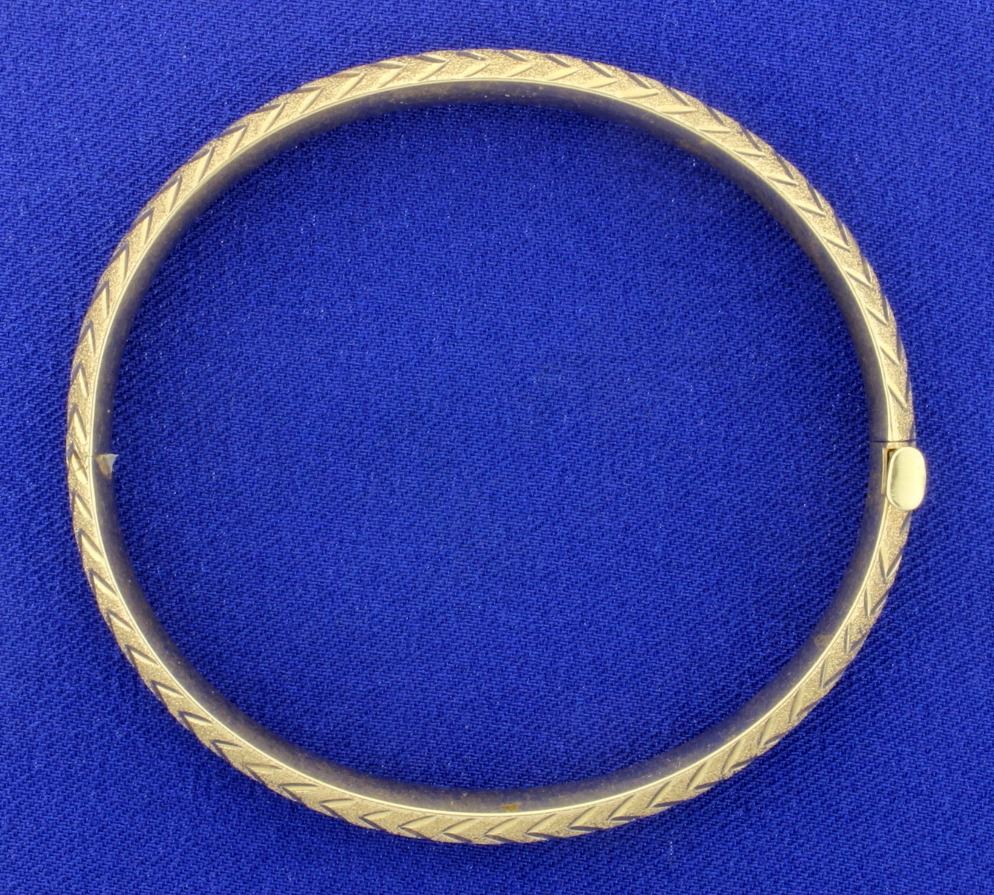 It is 14K yellow gold, the bangle is 2 1/2 inches in diameter and 8.1mm wide. 11.6g