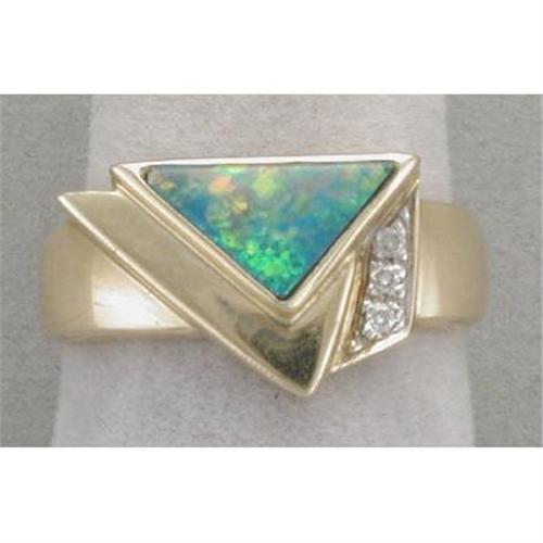 Striking contemporary 14K (marked 585, 14K, CG) ring set (with open back so that you can see the back of the stone)with an excellent black opal (showing flashes of blue, green, red, yellow). Accented with three diamonds ranging from .02 to .03 carats each. It is a size 8 and weighs 5.3 grams.
