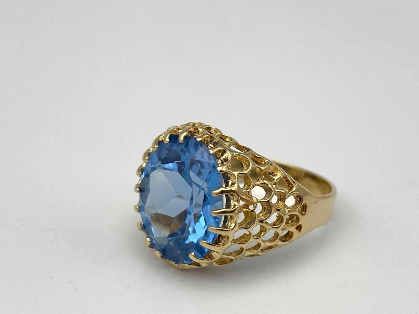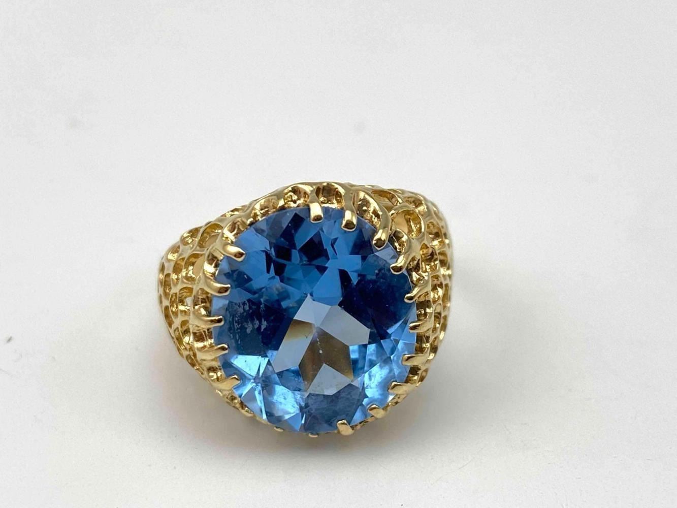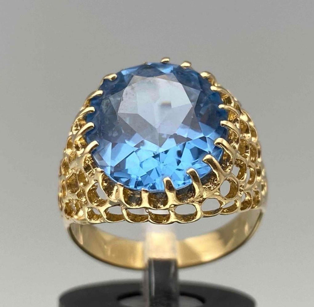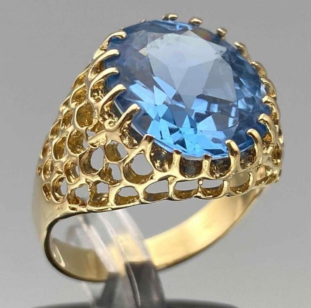 14K Blue Topaz Ring, 4.7g. Marked 14k. Stone Slightly Loose In Setting. Ring Front Approximately 0.625W x 0.6875W in. Topaz Approximately 6ct, 14.08L x 12.19W mm. Approximate Ring Size 7. ALL CREDIT CARDS WILL BE MANUALLY VERIFIED PRIOR TO SHIPMENT.