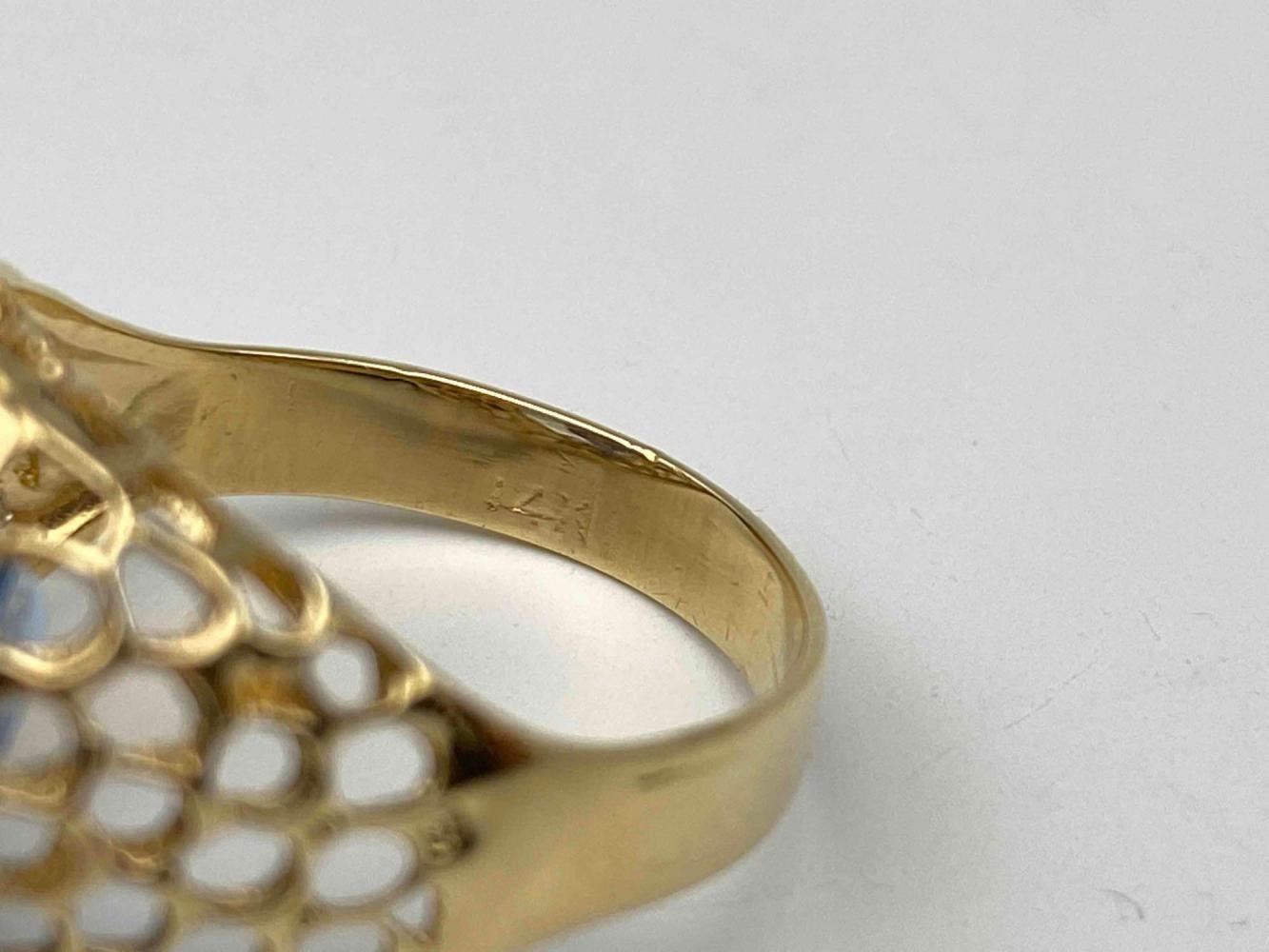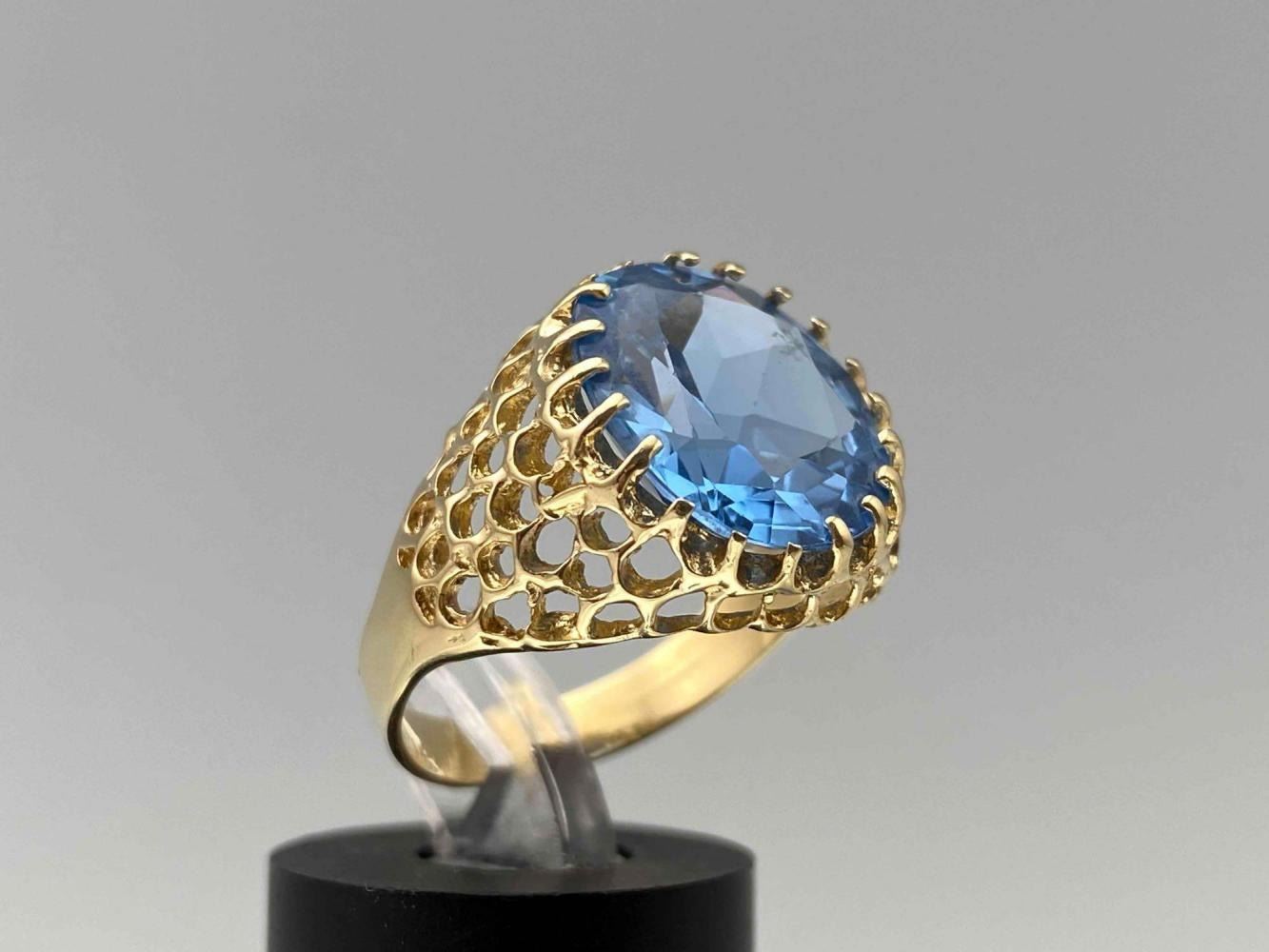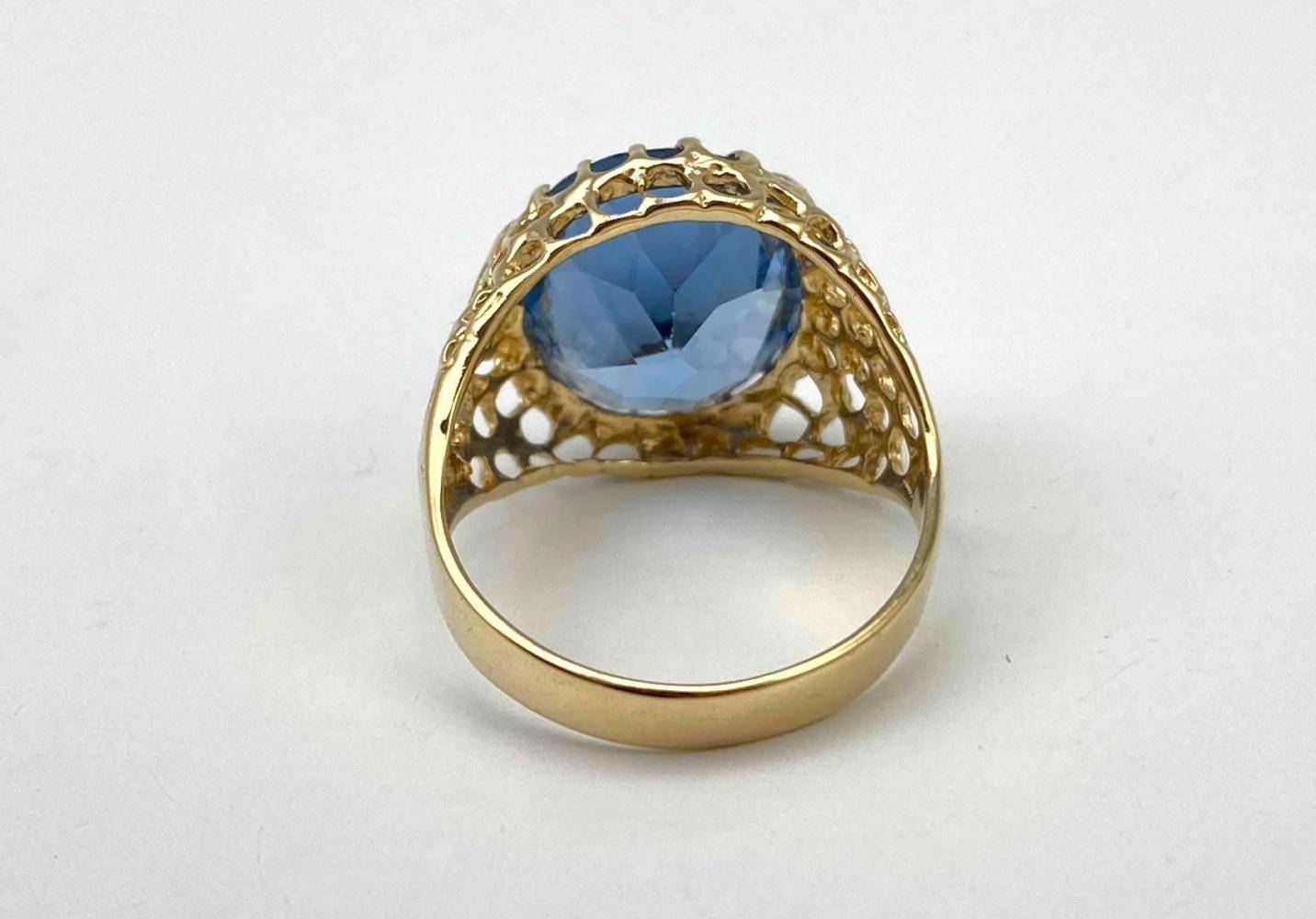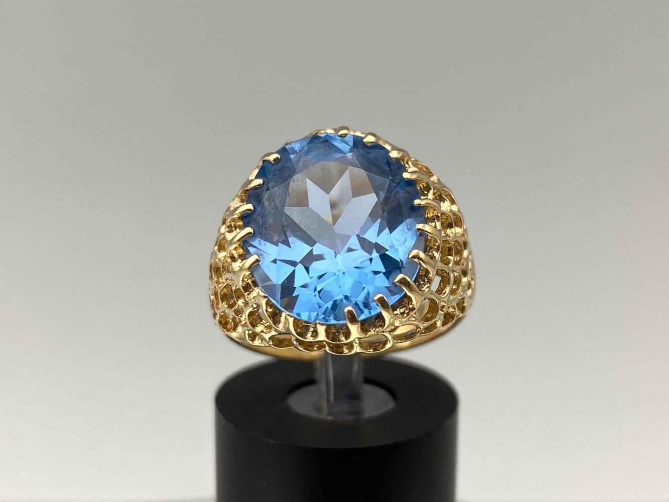 14K Blue Topaz Ring, 4.7g. Marked 14k. Stone Slightly Loose In Setting. Ring Front Approximately 0.625W x 0.6875W in. Topaz Approximately 6ct, 14.08L x 12.19W mm. Approximate Ring Size 7. ALL CREDIT CARDS WILL BE MANUALLY VERIFIED PRIOR TO SHIPMENT.