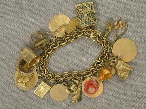 14 K YELLOW GOLD CHARM BRACELET INCLUDING EIGHTEEN (18) ASSORTED CHARMS, LOCKETS, AND THIMBLE. 84.9 GRAMS.