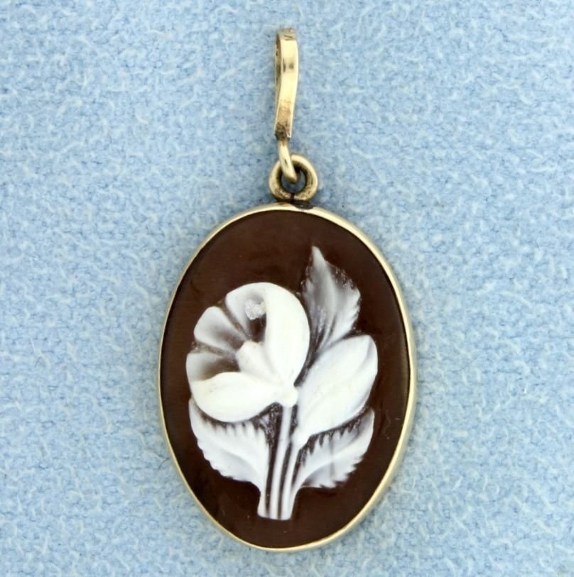 In 14K yellow gold there is a picture of a flower, great detail! It is about 1 inch long with the bale. 1.1g