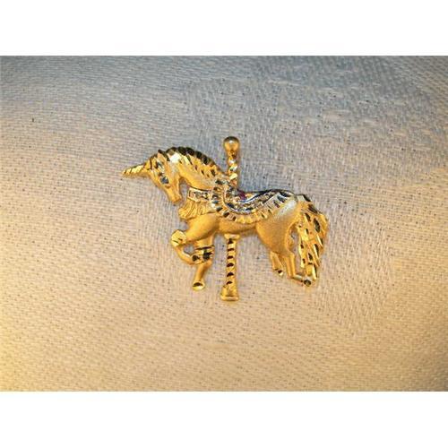 You are looking at an estate 14K yellow gold carousel horse gemstone brooch. This uniquely designed piece features a gold horse with one natural sapphire at its eye, one natural ruby on its back and 4 round diamonds, each measuring less than 1 mm in diameter. The brooch measures 1 and 1/4 of an inch wide by 1 inch long. The pin weighs 3.7 grams. It is in mint condition.