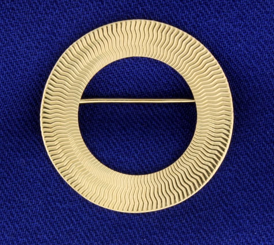 This 14K yellow gold pin is 1 inch in diameter. 2.7g