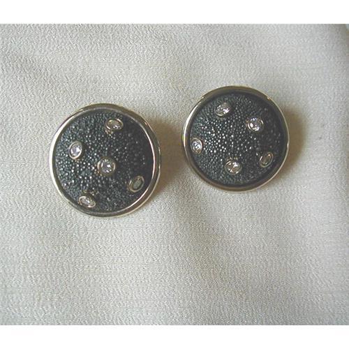 GREAT CHIC LOOK ~ VERY UNIQUE 1 1/4" ROUND EARRINGS OF 14K YELLOW GOLD & BLACKENED TEXTURED METAL SET WITH ROUND DIAMONDS / Each earrings is different in the placement of the 5 bezel-set round diamonds. Diamonds: 1.50 carats. These special earrings were custom made and one-of-a-kind polkadot diamond earrings/ The earring backs are clip backs. These are not light weight earrings. BURTON BROOK FARM ANTIQUES always for the unique and rare. Please view our entire collection.