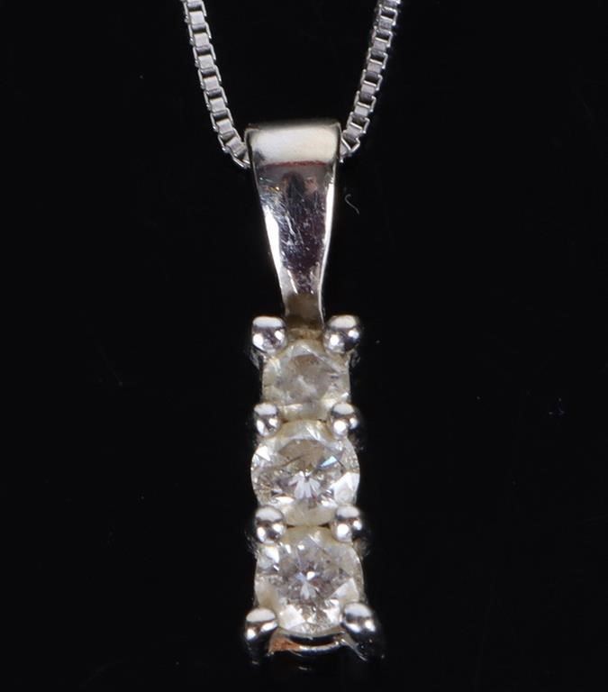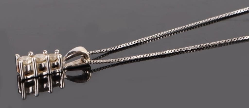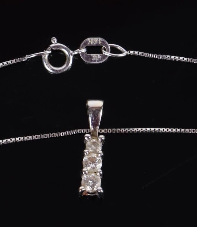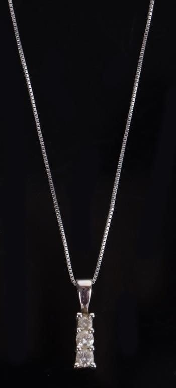14K white gold 3 stone diamond graduating journey pendant necklace.