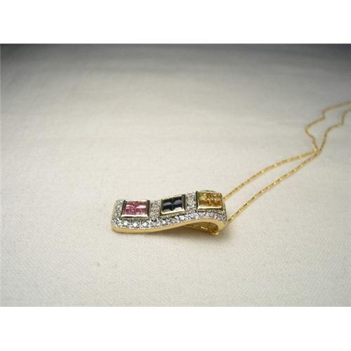 You are looking at an estate 14K yellow gold pendant with multi-color sapphires and diamonds. All gemstones are natural. This uniquely designed rectangular piece features three square clusters of 4 sapphires, each cluster a different color (pink, yellow, and blue). The 12 stones weigh in total .88 ct. and each stone measures 2 mm by 2 mm. The sapphires are surrounded by 23 brilliant round diamonds, each measuring about 1 mm in diameter and weigh .17 of a carat. The pendant measures 7/8 of an inch long by 1/4 of an inch wide. It also comes on a beautiful gold chain that is about 17 inches long with a generic clasp. The piece weighs 3.9 grams. It is in mint condition.