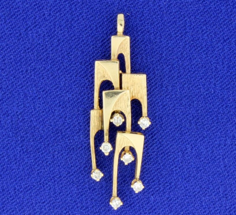 In 14K yellow gold, this pendant contains seven .03ct diamonds, SI clarity/H color. It is 1 1/2 inches long. 3.2g