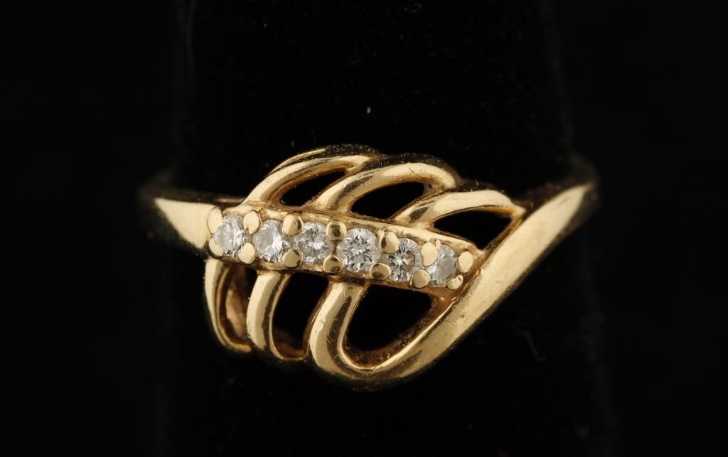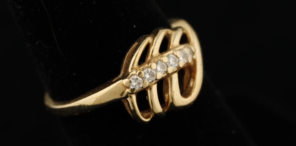 Tasteful diamond ring in 14K yellow gold. The ring features 6 very nice, clean diamonds- VS/SI, H-I-that total about 0.25 cctw set in a line across the swirls of gold. It is sized 5.5 and weighs 3.3 grams.