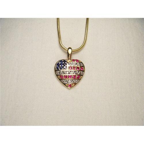 You are looking at an estate 14K yellow gold ruby sapphire and diamond american flag pendant. This unique piece features 3 brilliant round diamonds, 8 natural round sapphires and 12 natural round rubies measuring 1 mm each. The gemstones form an american flag design in a yellow gold heart setting. The pendant measures 13/16 of an inch long including the bale by 5/8 of an inch wide. It weighs 2.4 grams. It is in mint condition.