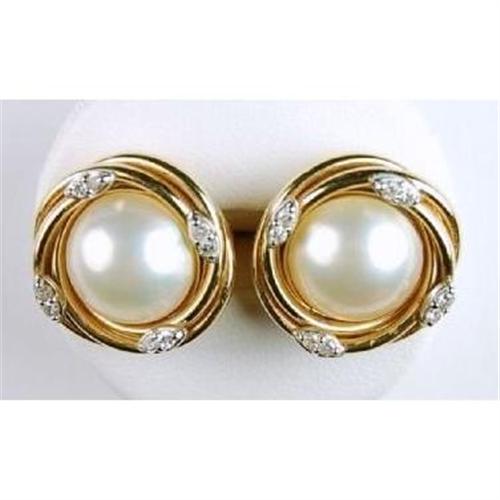Each 14k Yellow Gold Earring features a beautiful MABE PEARL 10MM across. The Pearl is surrounded by 14k Gold swirls set with Diamonds. There are 16 Diamonds with a Total Weight = .16 Carats. The Earrings measure 3/4" across and they ARE stunning.