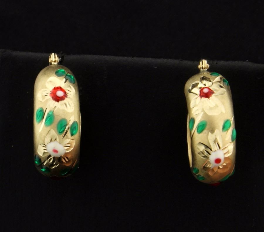 In 14K yellow gold, they have beautiful workmanship on them and the hand painted enamel is really beautiful. They are about 3/4 inch long. 1.3g