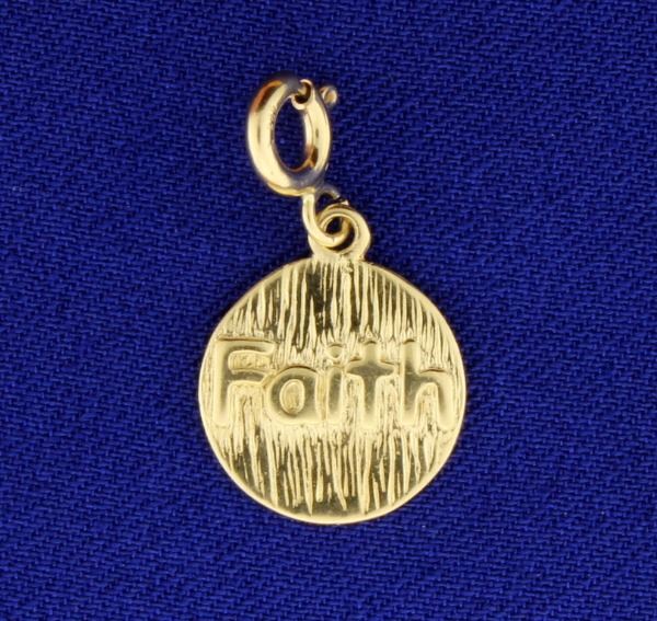In 14K yellow gold it is about 1 inch long and the word "faith" is raised. 1.3g