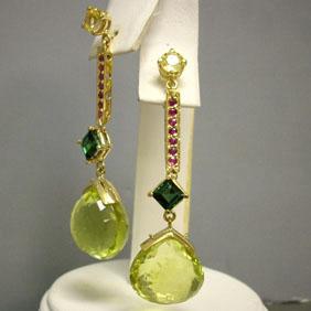 14K YELLOW GOLD CITRINE, RUBY AND TOURMALINE DANGLE EARRINGS. THEY WEIGHT 11.40 GR. THE CENTER STONE OF THE EARRINGS ARE LEMON CITRINE THAT WEIGHT 20 CTS APPROX SURROUNDED BY RUBY AND TOURMALINE. LENGTH: 50 MM LONG