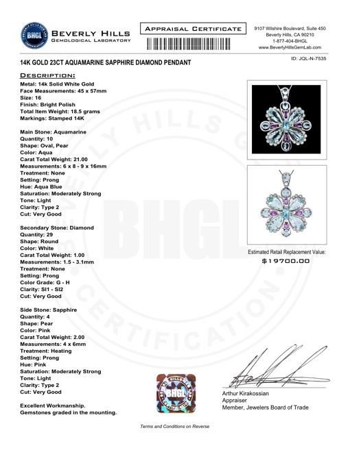Regarding Appraised Jewelry and Loose Stones - WESTBURY AUCTION GALLERIES sends them out to a third party for Retail Replacement Value Appraisals, which are the most common. These types of evaluations are written for insurance needs. This would be the cost to replace the jewelry with an item of equal quality and kind, considered to be the current market price or the replacement value. This type of appraisal is done to protect you in the event of damage or loss of a valuable item. Our appraisals are conducted by independent 3rd Party appraisal firms that utilizes Certified GIA Gemologist. Appraisals should be used for verification of gemstone and/or metal weight, size, and grade only, not actual value. Appraisal value should be considered for insurance purposes only, not actual value, as price varies greatly from retail locations thru out the world. Items should not be purchased with the expectation to resell for appraisal price, or for profit.