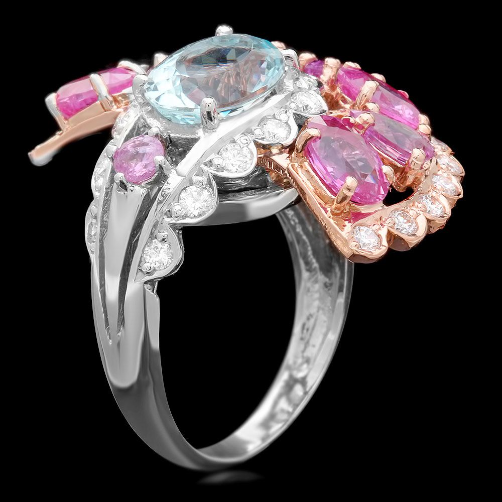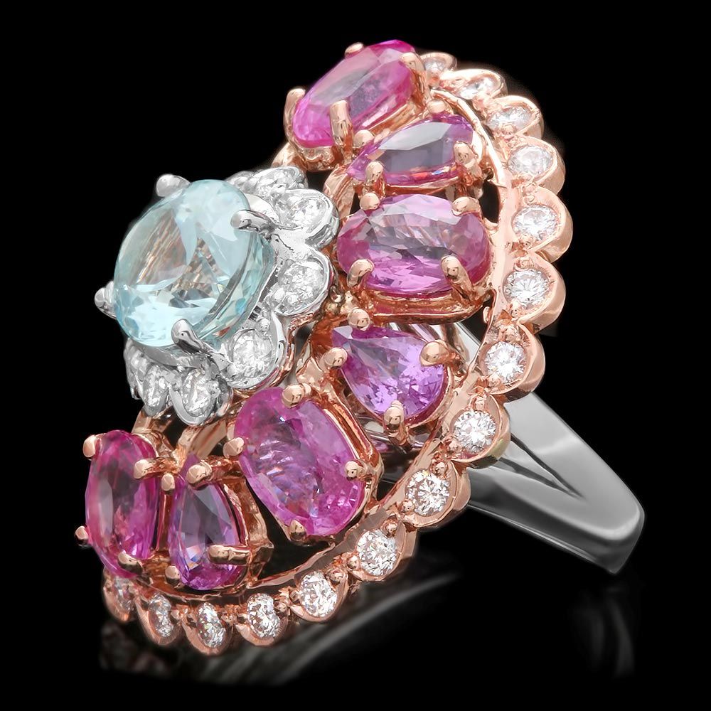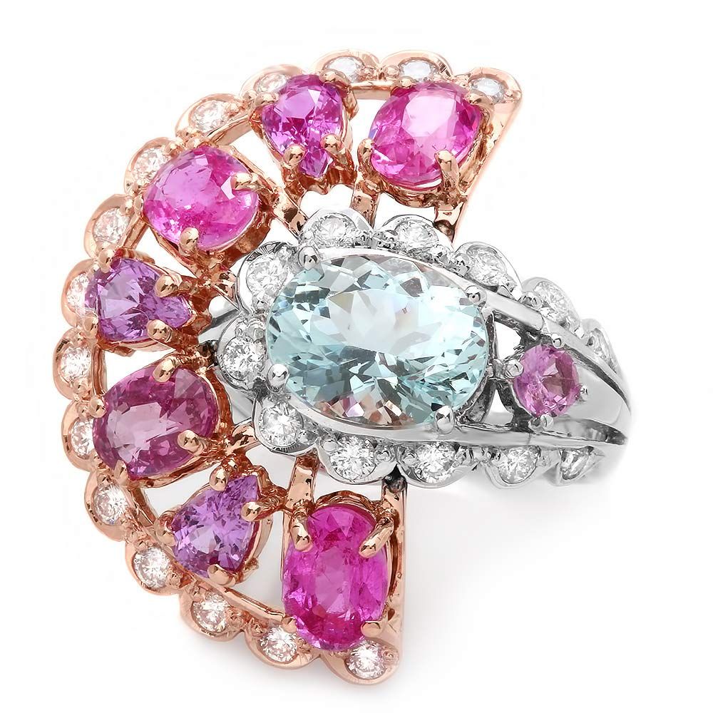 Retail: $15850.00 ****** Metal: 14k Solid Multi-Tone Gold / Size: 7.5 / Total Item Weight: 11.9 grams / Country Made: USA / / Main Stone: Aquamarine / Color: Aqua / Carat Total Weight: 3.00 / Treatment: None / Clarity: Type 2 / Cut: Very Good / / Secondary Stone: Diamond / Carat Total Weight: 1.00 / Treatment: None / Color Grade: G - H / Clarity: SI1 - SI2 / Cut: Very Good / / Side Stone: Sapphire / Color: Pink / Carat Total Weight: 5.35 / Treatment: Heating / Clarity: Type 2 / Cut: Very Good / ****** Ref: JQL-R-6380