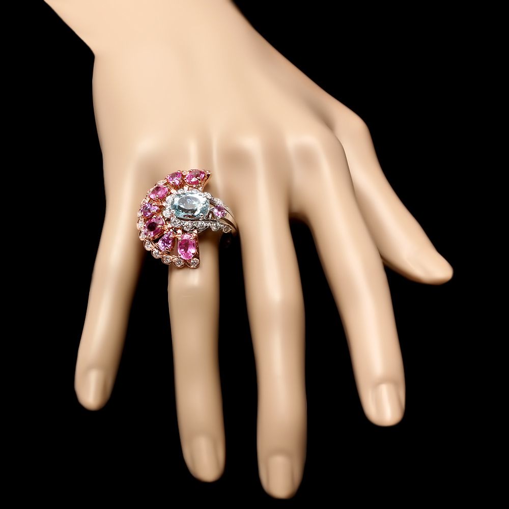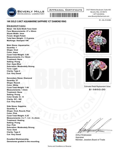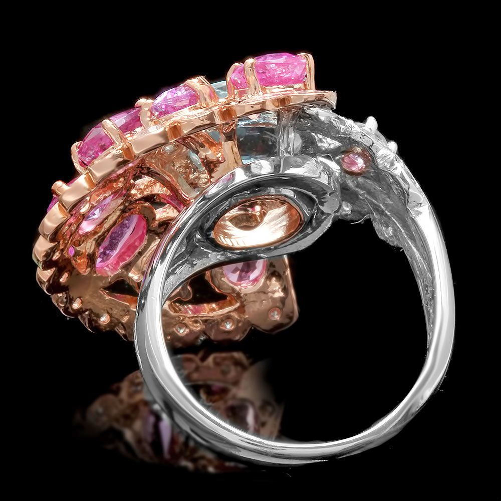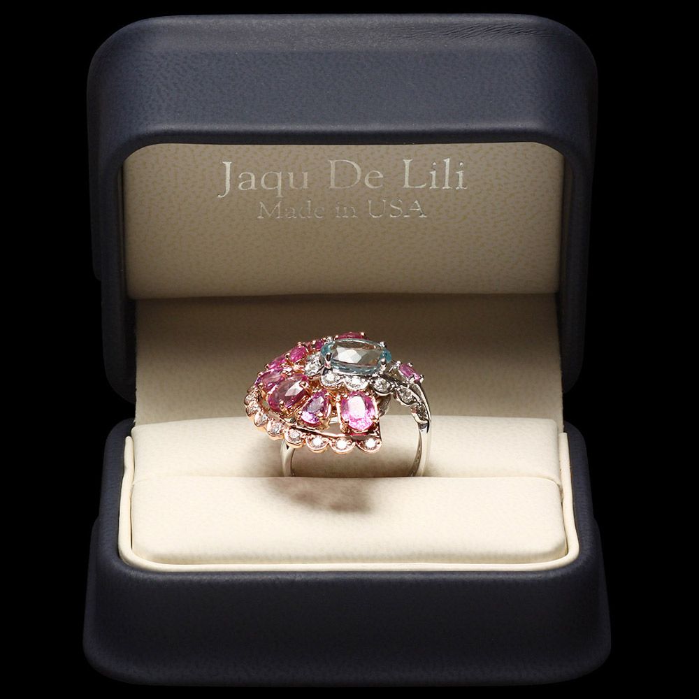 Retail: $15850.00 ****** Metal: 14k Solid Multi-Tone Gold / Size: 7.5 / Total Item Weight: 11.9 grams / Country Made: USA / / Main Stone: Aquamarine / Color: Aqua / Carat Total Weight: 3.00 / Treatment: None / Clarity: Type 2 / Cut: Very Good / / Secondary Stone: Diamond / Carat Total Weight: 1.00 / Treatment: None / Color Grade: G - H / Clarity: SI1 - SI2 / Cut: Very Good / / Side Stone: Sapphire / Color: Pink / Carat Total Weight: 5.35 / Treatment: Heating / Clarity: Type 2 / Cut: Very Good / ****** Ref: JQL-R-6380
