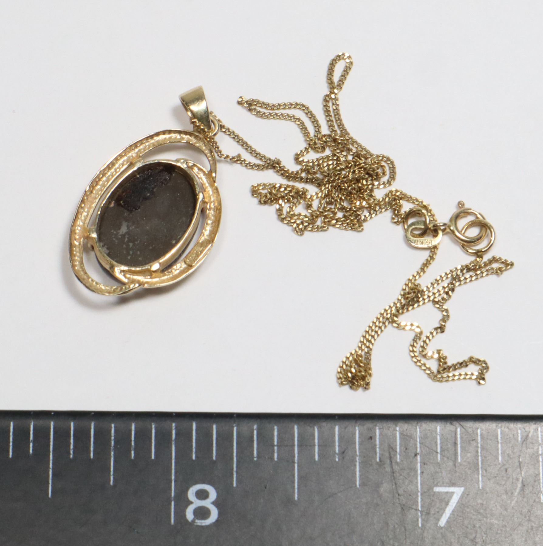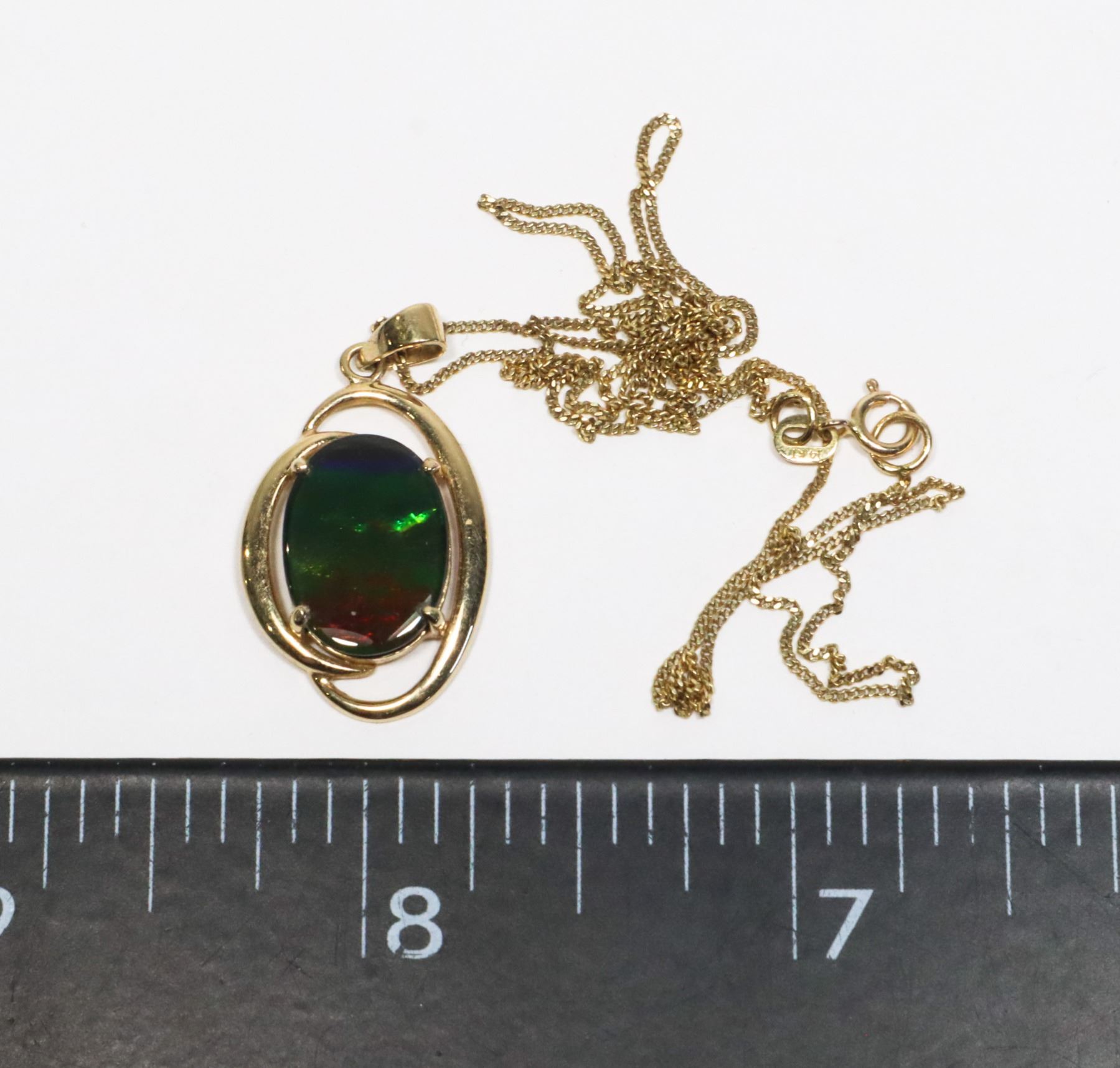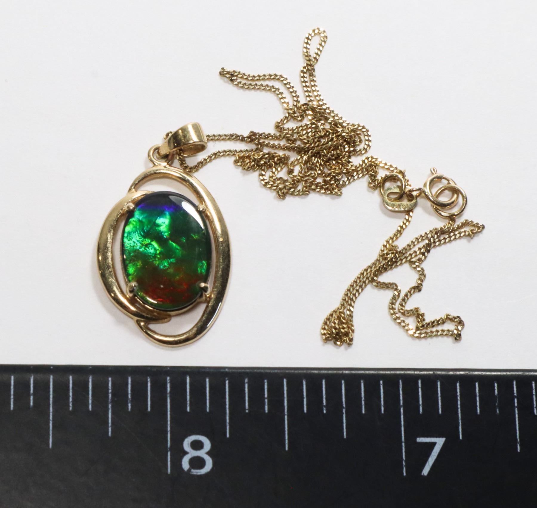BURB CHAIN IS STAMPED 14K. PENDANT IS STAMPED 14K. WEIGHTS 3.34GRAMS. THE OVAL AMMOLITE TRIPLET MEASURES APPROXIMATELY 10X14MM. HAS BEEN APPRAISED AT LOCAL JEWELER FOR $1000+ GST. COPY OF APPRAISAL COMES WITH, ORIGINAL NOT AVAILABLE