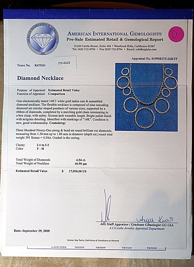 LADY'S 14K WHITE GOLD NECKLACE WITH 391 PRONG AND BEAD SET ROUND BRILLIANT CUT DIAMONDS. DIAMONDS: 4.54CTW CLARITY: I-1 TO I-2 COLOR: F-H. COMES WITH AIG REPORT. ESTIMATED RETAIL VALUE (AT TIME OF APPRAISAL: 2008): $17,900.00.