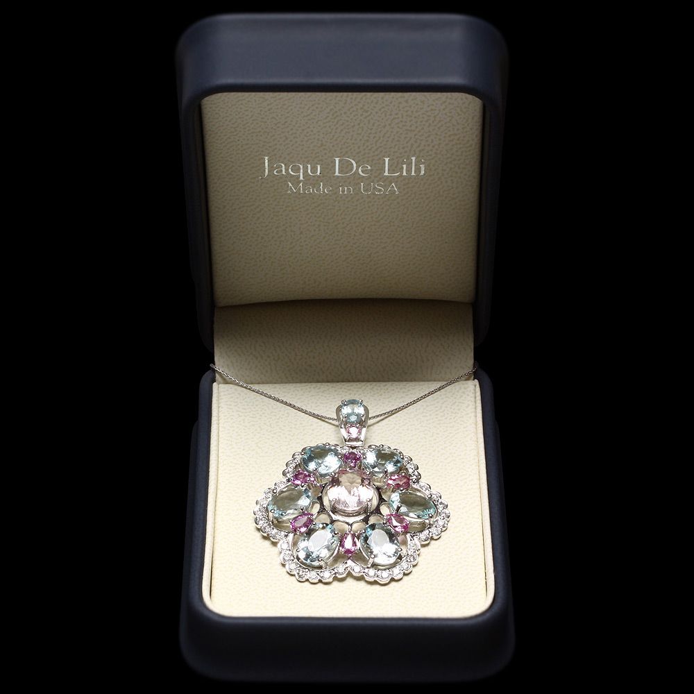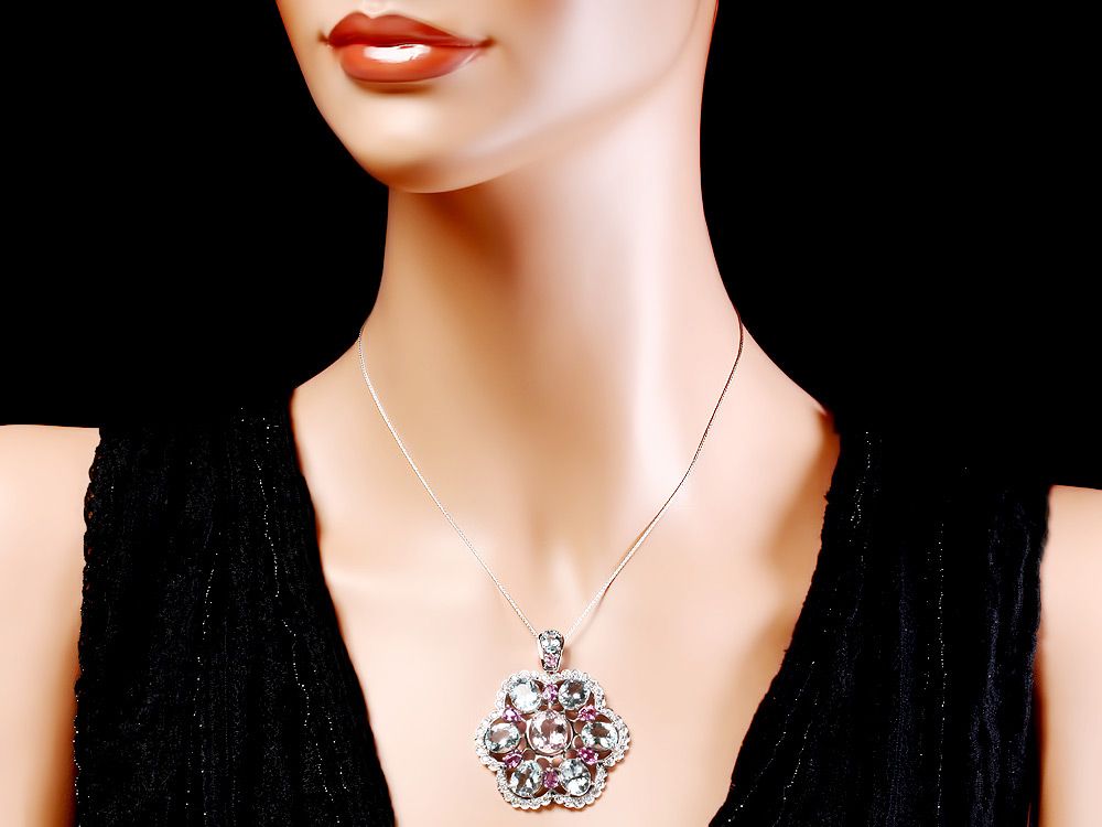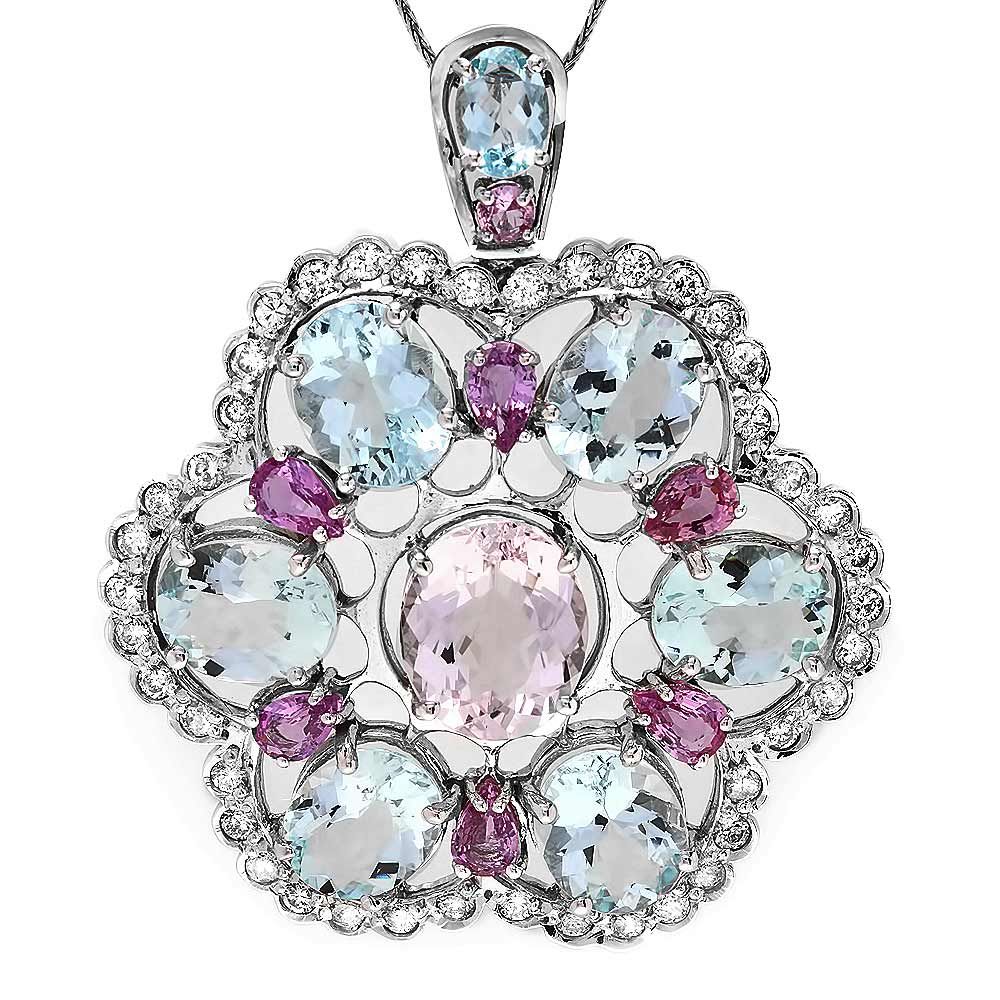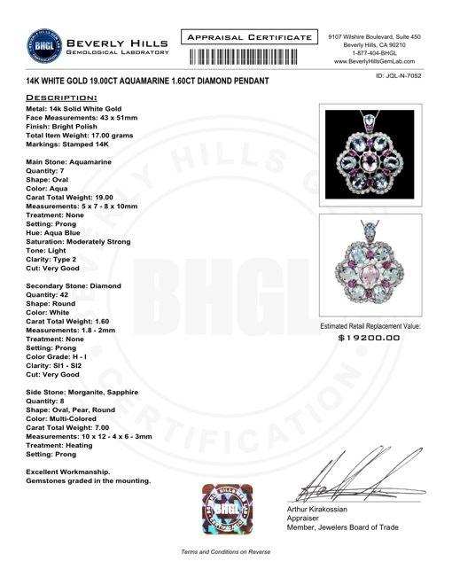 Retail: $19200.00 ****** Metal: 14k Solid White Gold / Size: 16 / Total Item Weight: 17.00 grams / Country Made: USA / / Main Stone: Aquamarine / Color: Aqua / Carat Total Weight: 19.00 / Treatment: None / Clarity: Type 2 / Cut: Very Good / / Secondary Stone: Diamond / Carat Total Weight: 1.60 / Treatment: None / Color Grade: H - I / Clarity: SI1 - SI2 / Cut: Very Good / / Side Stone: Morganite Sapphire / Color: Multi-Colored / Carat Total Weight: 7.00 / Treatment: Heating / ****** Ref: JQL-N-7052