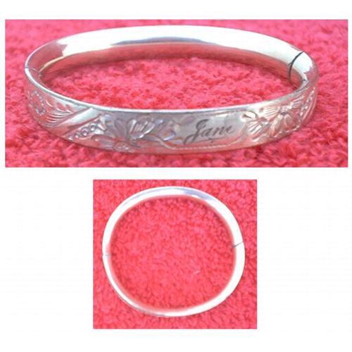 This is a precious 14K gold baby bracelet with floral engravings and Jane monogrammed in the center on the front, the back is plain. It is 2" round and in excellent condition.