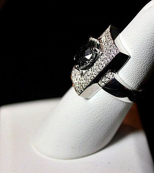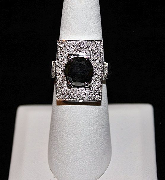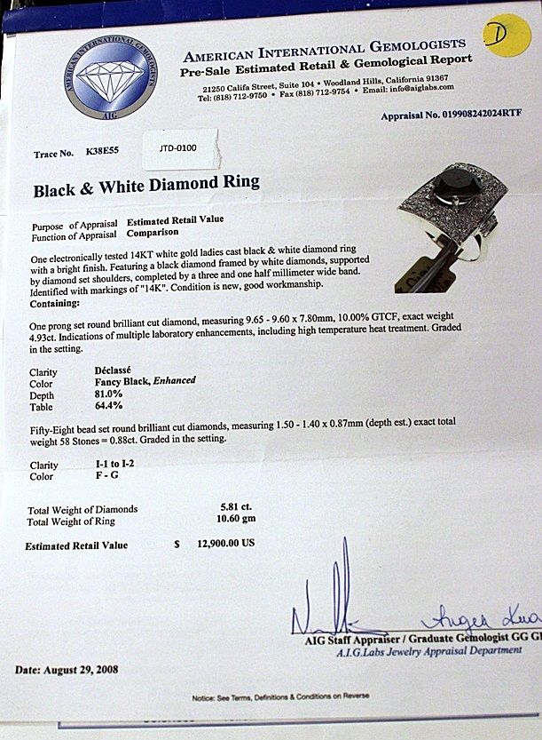 LADY'S 14K WHITE GOLD RING WITH 1 ROUND BRILLIANT CUT BLACK DIAMOND AND 58 BEAD SET ROUND BRILLIANT CUT DIAMONDS. BLACK DIAMOND: 4.93CTW COLOR: FANCY BLACK, ENHANCED WHITE DIAMONDS: 0.88CTW CLARITY: I-1/ I-2 COLOR: F-G. COMES WITH AIG REPORT. ESTIMATED RETAIL VALUE (AT TIME OF APPRAISAL: 2008): $12,900.00.