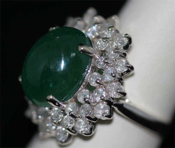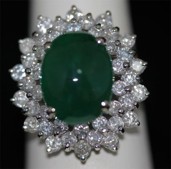 14K GOLD CABUSHION EMERALD AND DIAMOND RING **|**|** 14K GOLD CABUSHION EMERALD AND DIAMOND RING; MAINSTONE 9.67 CTW; DIAMOND 1.52 CTW; GOLD 10.85 GRAMS/ 14K WHITE ; MSRP: $0