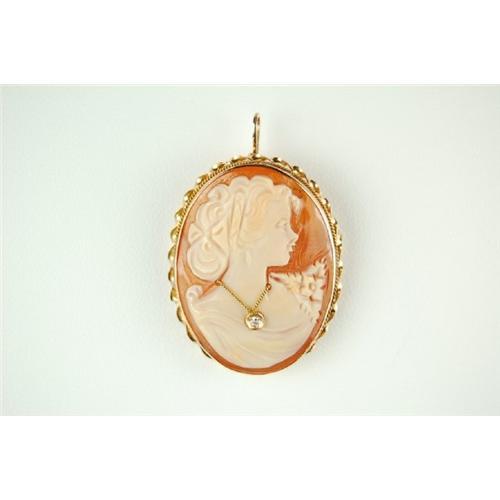 This 14k Yellow Gold CAMEO can be worn as both a PIN and as a PENDANT. It features the CAMEO of a young woman in profile looking to her left, and she is wearing a DIAMOND necklace. This 14k Gold Pin and Pendant measures 1 1/2" x 1 1/4" and it is in Mint condition.