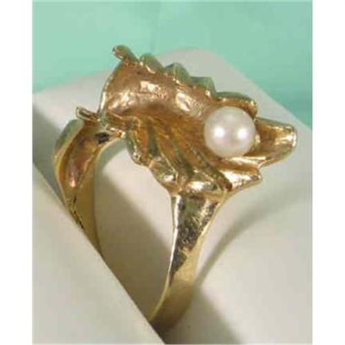 This is a leaf curled over a pearl. The leaf measures 7/8" wide and 1/2" across. The ring is marked 14k.It weighs approximately 6 grammes. The pearl is a size 2 and is cultered. Circa 1960.