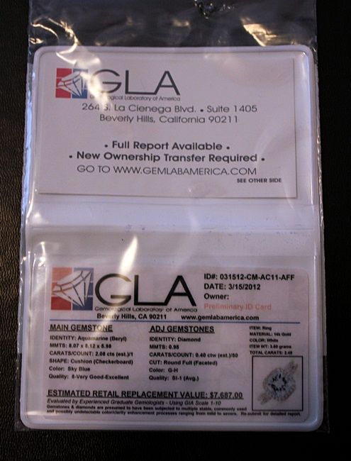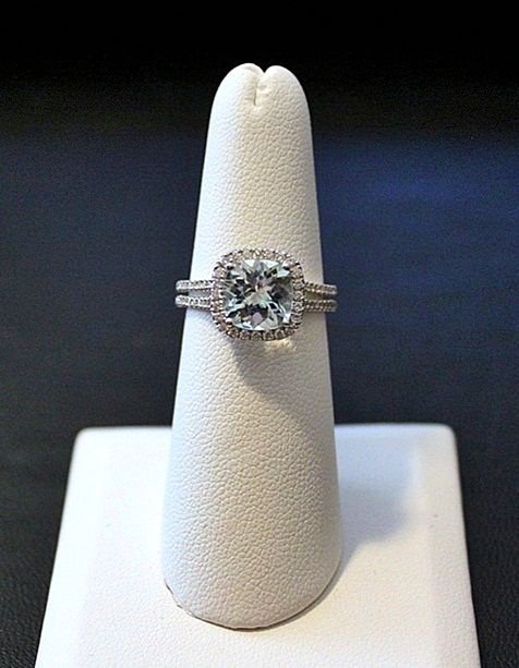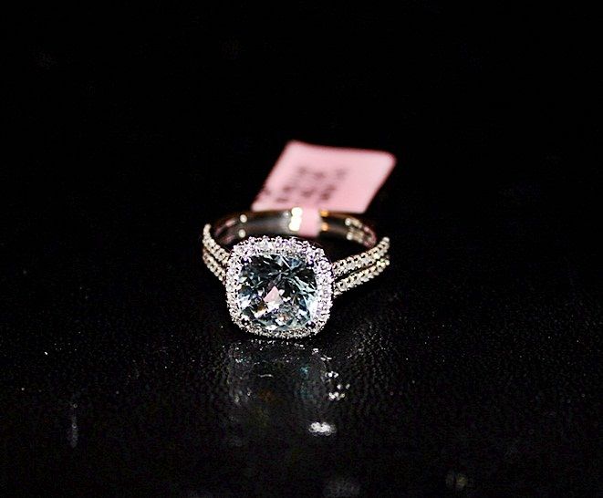 14K WHITE GOLD RING WITH 1 CUSHION CUT AQUAMARINE AND 80 ROUND FULL CUT DIAMONDS. GOLD: 3.43G DIAMONDS: 0.40CTW COLOR: G-H QUALITY: SI-1 AQUAMARINE: 2.08CTW COLOR: SKY BLUE QUALITY: 8-VERY GOOD/EXCELLENT. COMES WITH GLA CERTIFICATE. RETAIL PRICE: $5268.00 - $7687.00.