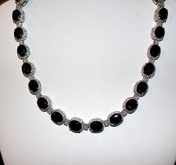 LADY'S 14K WHITE GOLD NECKLACE WITH 25 OVAL MIXED CUT BLUE SAPPHIRES AND 594 ROUND BRILLIANT CUT DIAMONDS. DIAMONDS: 6.00CTW CLARITY: I-1/I-2 COLOR:F-I BLUE SAPPHIRE: 83.16CTW CLARITY: SEVERLY INCLUDED, TYPE II COLOR: VERY DARK, VS GRAYISH, VIOLETISH BLUE. COMES WITH AIG REPORT. ESTIMATED RETAIL VALUE (AT TIME OF APPRAISAL: 2009): $29,500.00.