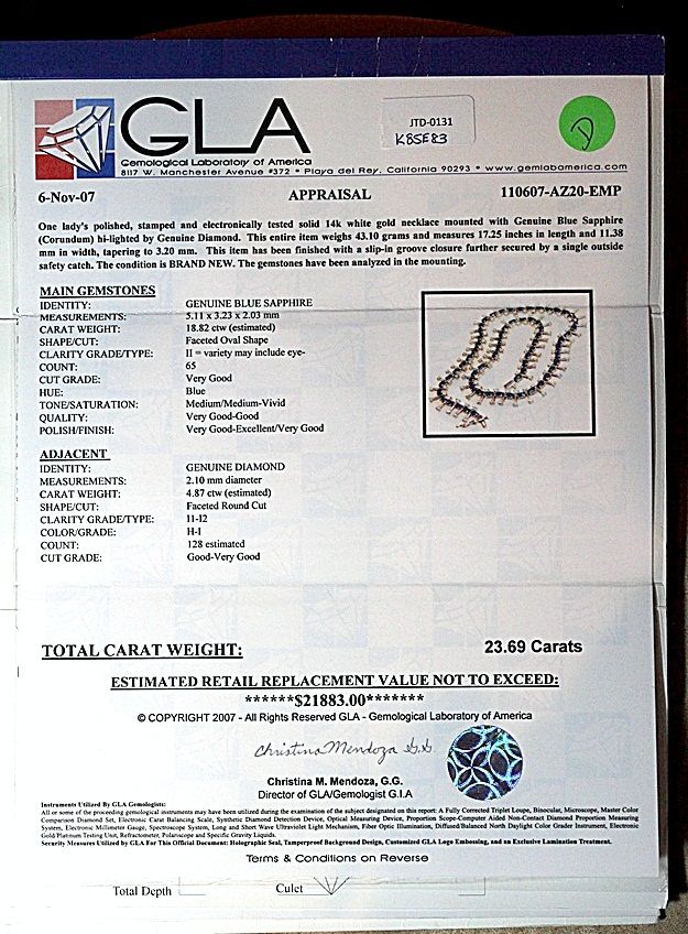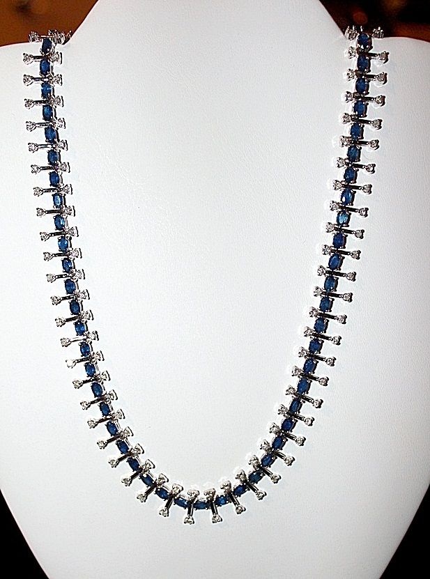 LADY'S 14K WHITE GOLD NECKLACE WITH 65 FACETED OVAL CUT BLUE SAPPHIRES AND 128 ROUND CUT DIAMONDS. DIAMONDS: 4.87CTW CLARITY: I1-I2 COLOR: H-I BLUE SAPPHIRE: 18.82CTW CLARITY: II COLOR: MED./MED. VIVID BLUE. COMES WITH GLA APPRAISAL. ESTIMATED RETAIL VALUE (AT TIME OF APPRAISAL: 2007): $21,883.00.
