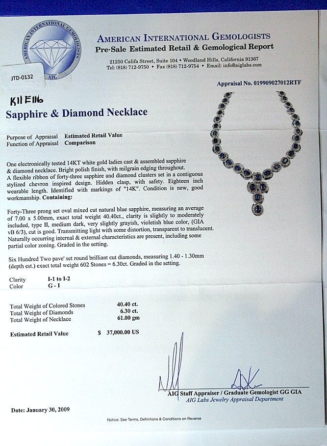 LADY'S 14K WHITE GOLD NECKLACE WITH 43 OVAL MIXED CUT BLUE SAPPHIRES AND 602 PAVE SET ROUND BRILLIANT CUT DIAMONDS. DIAMONDS: 6.30CTW CLARITY: I-1 TO I-2 COLOR: G-I BLUE SAPPHIRE: 40.40CTW CLARITY: SLIGHTLY TO MODERATELY INCLUDED, TYPE II COLOR: MED. DARK, VERY SLIGHTLY GRAYISH, VIOLETISH BLUE. COMES WITH AIG REPORT. ESTIMATED RETAIL VALUE (AT TIME OF APPRAISAL: 2009): $37,000.00.