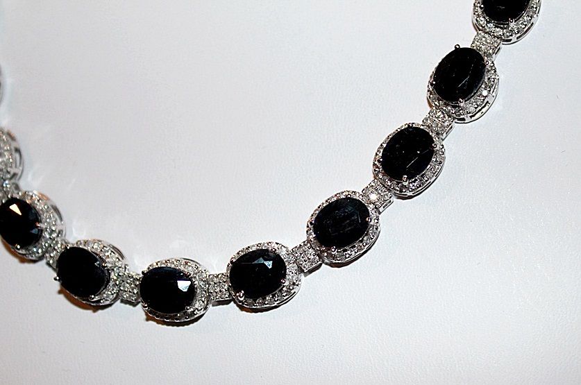 LADY'S 14K WHITE GOLD NECKLACE WITH 25 OVAL MIXED CUT BLUE SAPPHIRES AND 594 ROUND BRILLIANT CUT DIAMONDS. DIAMONDS: 6.00CTW CLARITY: I-1/I-2 COLOR:F-I BLUE SAPPHIRE: 83.16CTW CLARITY: SEVERLY INCLUDED, TYPE II COLOR: VERY DARK, VS GRAYISH, VIOLETISH BLUE. COMES WITH AIG REPORT. ESTIMATED RETAIL VALUE (AT TIME OF APPRAISAL: 2009): $29,500.00.