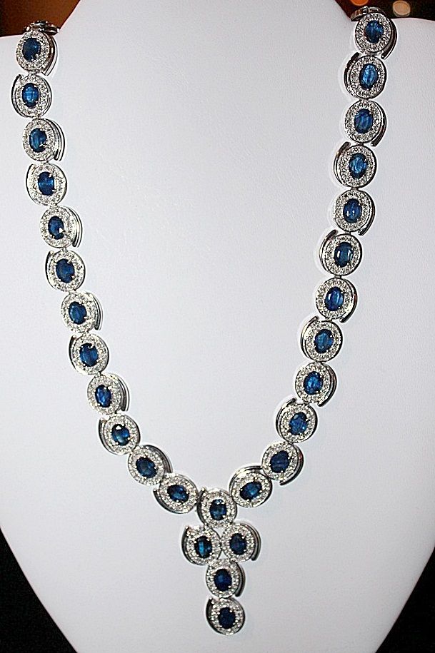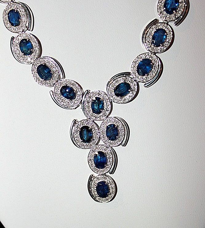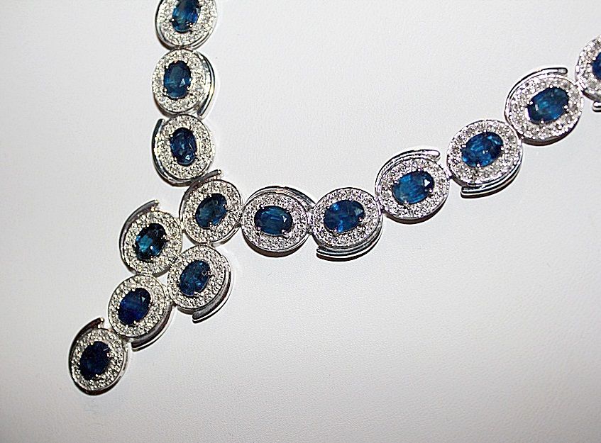LADY'S 14K WHITE GOLD NECKLACE WITH 43 OVAL MIXED CUT BLUE SAPPHIRES AND 602 PAVE SET ROUND BRILLIANT CUT DIAMONDS. DIAMONDS: 6.30CTW CLARITY: I-1 TO I-2 COLOR: G-I BLUE SAPPHIRE: 40.40CTW CLARITY: SLIGHTLY TO MODERATELY INCLUDED, TYPE II COLOR: MED. DARK, VERY SLIGHTLY GRAYISH, VIOLETISH BLUE. COMES WITH AIG REPORT. ESTIMATED RETAIL VALUE (AT TIME OF APPRAISAL: 2009): $37,000.00.