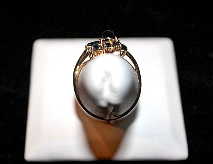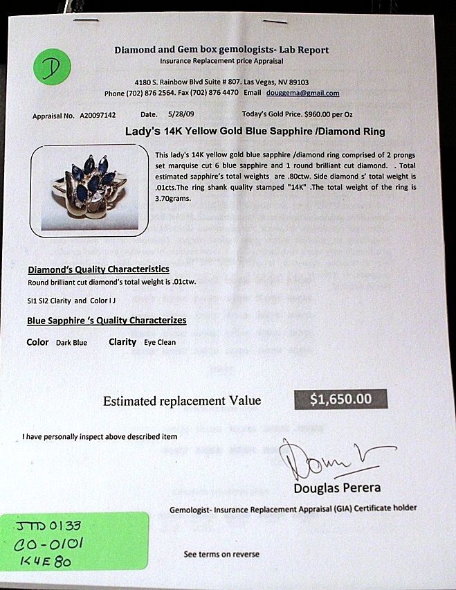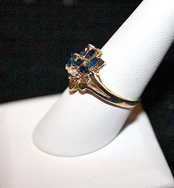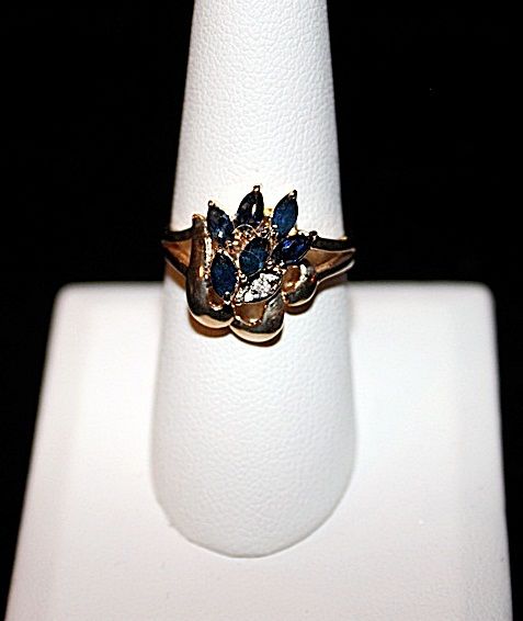 LADY'S 14K YELLOW GOLD RING WITH 6 MARQUISE CUT BLUE SAPPHIRE AND 1 ROUND BRILLIANT CUT DIAMOND. DIAMOND: 0.01CTW CLARITY: SI1-SI2 COLOR: I-J BLUE SAPPHIRE: 0.80CTW CLARITY: EYE CLEAN COLOR: DARK BLUE. COMES WITH GIA CERTIFIED APPRAISAL. ESTIMATED REPLACEMENT VALUE (AT TIME OF APPRAISAL: 2009): $1650.00.