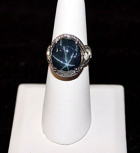 14K WHITE GOLD RING WITH 1 OVAL CABOCHON BLUE STAR SAPPHIRE AND 86 ROUND SINGLE CUT DIAMONDS. DIAMONDS: 0.64CTW CLARITY: I1 COLOR: H-I SAPPHIRE: 12.27CTW CLARITY: 6, VERY GOOD-GOOD COLOR: ROAYAL BLUE, OPAQUE/STRONG. COMES WITH GLA APPRAISAL. ESTIMATED RETAIL VALUE (AT TIME OF APPRAISAL: 2009): $12,936.00.