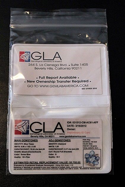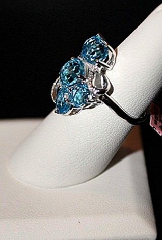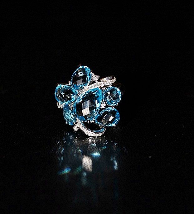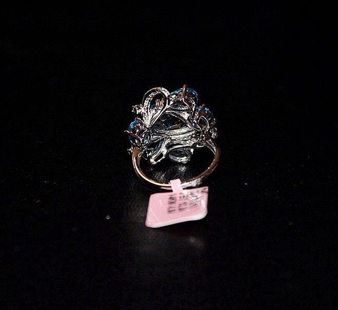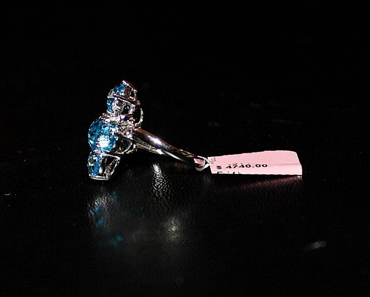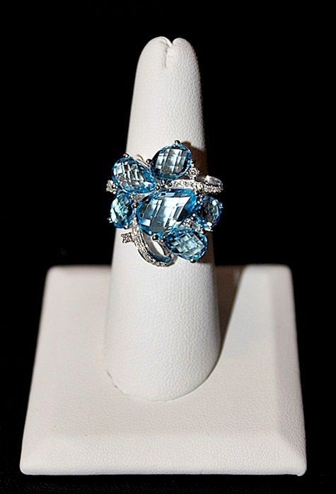 14K WHITE GOLD RING WITH 6 OVAL, PEAR AND ROUND CHECKERBOARD CUT BLUE TOPAZS AND 28 ROUND FULL CUT DIAMONDS. GOLD: 4.84G DIAMONDS: 0.17CTW COLOR: G QUALITY: SI-1 BLUE TOPAZ: 10.34CTW COLOR: SWISS BLUE QUALITY: 10+ FINE. COMES WITH GLA CERTIFICATE. RETAIL PRICE: $4740.00 - $5750.00.