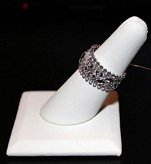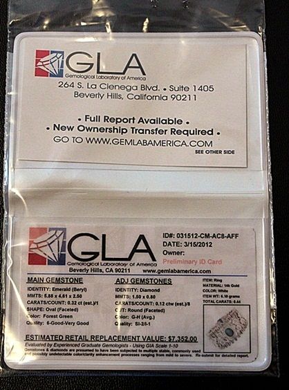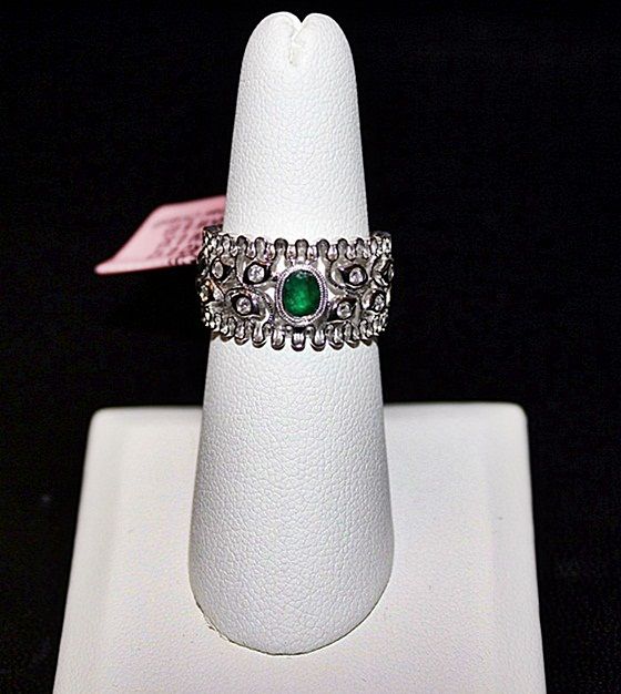 14K WHITE GOLD MICHAEL CHRISTOFF RING WITH 1 OVAL CUT EMERALD AND 8 ROUND CUT DIAMONDS. GOLD: 6.03G DIAMONDS: 0.12CTW COLOR: G-H QUALITY: SI-2/I-1 EMERALD: 0.32CTW COLOR: FOREST GREEN QUALITY: 6-GOOD/VERY GOOD. COMES WITH GLA CERTIFICATE. RETAIL PRICE: $4900.00 - $7352.00.