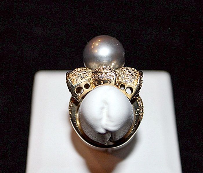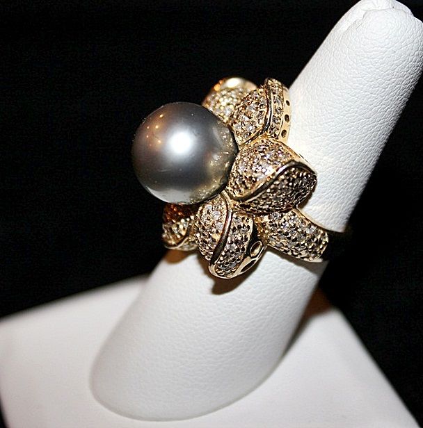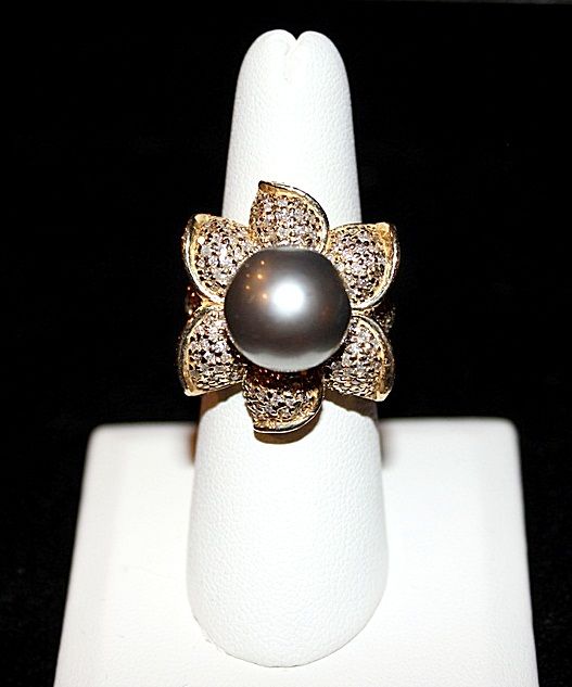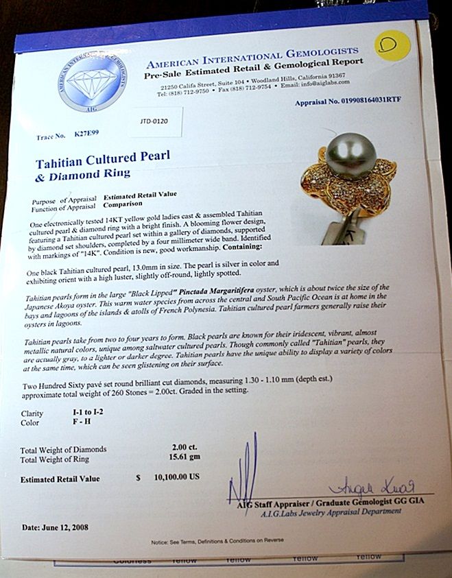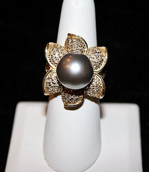 LADY'S 14K YELLOW GOLD RING WITH 1 BLACK TAHITIAN CULTURED PEARL AND 260 PAVE SET ROUND BRILLIANT CUT DIAMONDS. DIAMONDS: 2.00CTW CLARITY: I-1 TO I-2 COLOR: F-H PEARL: 13.0MM COLOR: SILVER, HIGH LUSTER, SLIGHTLY OFF-ROUND, LIGHTLY SPOTTED. COMES WITH AIG REPORT. ESTIMATED RETAIL VALUE (AT TIME OF APPRAISAL: 2008): $10,100.00.