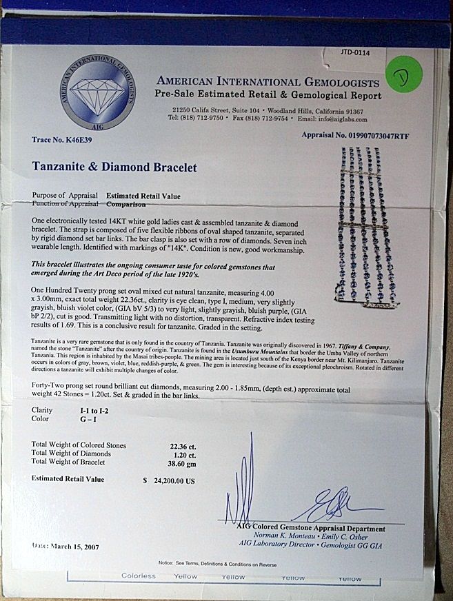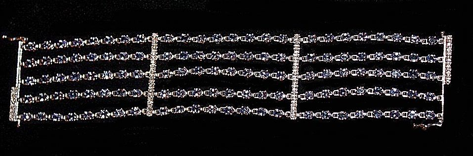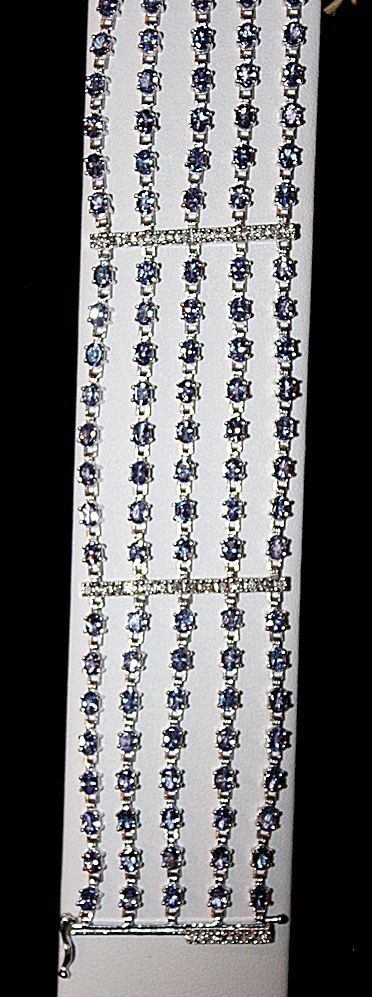 LADY'S 14K WHITE GOLD BRACELET WITH 120 OVAL MIXED CUT TANZANITES AND 42 ROUND BRILLIANT CUT DIAMONDS. DIAMONDS: 1.20CTW CLARITY: I-1/I-2 COLOR:G-I TANZANITE: 22.63CTW CLARITY: EYE CLEAN, TYPE I COLOR: MED., VS GRAYISH, BLUISH VIOLET. COMES WITH AIG REPORT. ESTIMATED RETAIL VALUE (AT TIME OF APPRAISAL: 2007): $24,200.00.