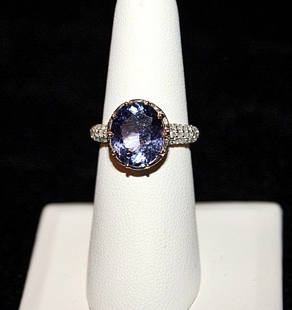 14K GOLD RING WITH 1 OVAL CUT TANZANITE AND 44 ROUND FULL CUT DIAMONDS. DIAMONDS: 0.57CTW CLARITY: I1-I2 COLOR: G-H TANZANITE: 5.13CTW CLARITY: 1ST VARIETY, FLAWLESS/NEAR FLAWLESS COLOR: PURPLISH BLUE OVERALL QUALITY: 6-VERY GOOD TO GOOD. COMES WITH GLA STANDARD APPRAISAL. ESTIMATED RETAIL VALUE (AT TIME OF APPRAISAL: 2009): $11,363.00.