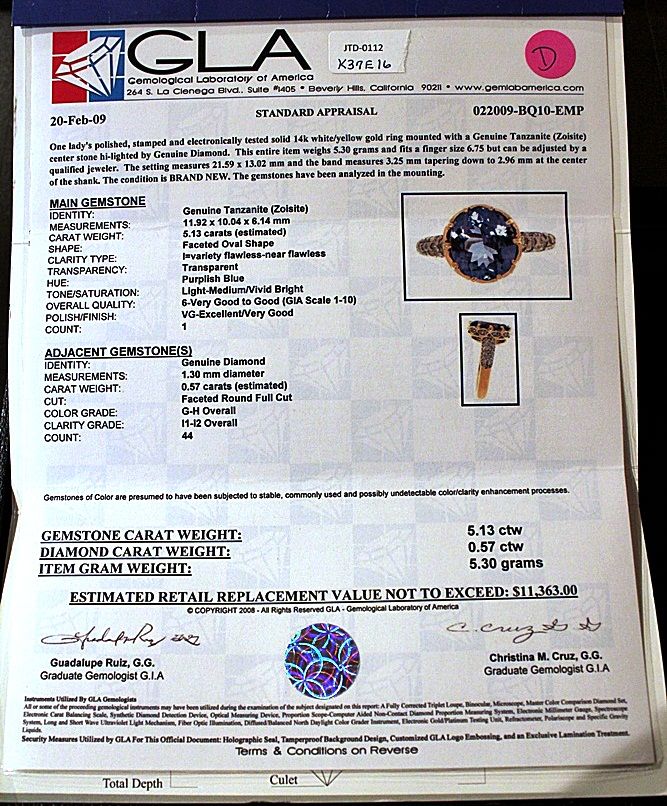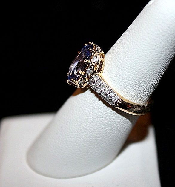 14K GOLD RING WITH 1 OVAL CUT TANZANITE AND 44 ROUND FULL CUT DIAMONDS. DIAMONDS: 0.57CTW CLARITY: I1-I2 COLOR: G-H TANZANITE: 5.13CTW CLARITY: 1ST VARIETY, FLAWLESS/NEAR FLAWLESS COLOR: PURPLISH BLUE OVERALL QUALITY: 6-VERY GOOD TO GOOD. COMES WITH GLA STANDARD APPRAISAL. ESTIMATED RETAIL VALUE (AT TIME OF APPRAISAL: 2009): $11,363.00.