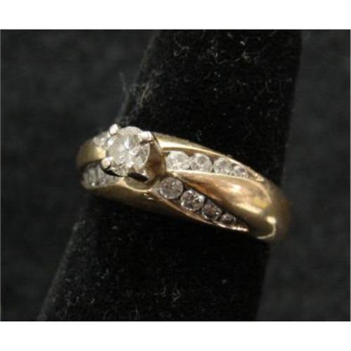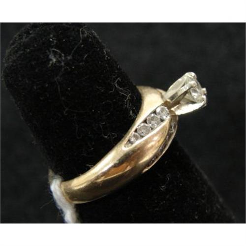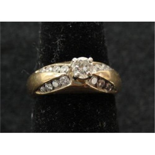 14K YELLOW GOLD DIAMOND ENGAGEMENT RING. Has single R.B.C. diamond with 8 small diamonds at each side. .82 t.c.w.