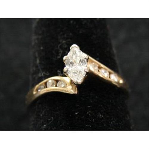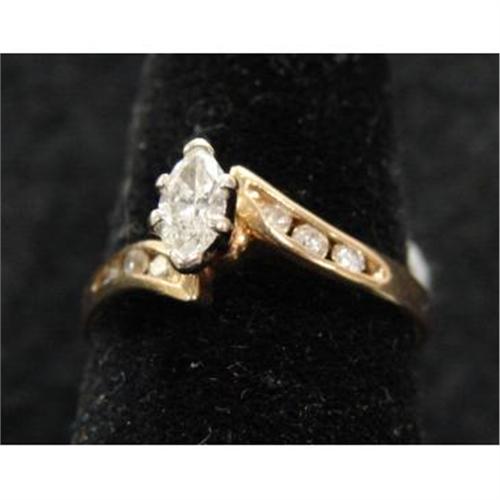 14K YELLOW GOLD & DIAMOND RING. Has single .30 ct. marquise cut diamond with 3 small diamonds at each side. .42 t.c.w.