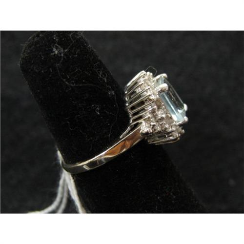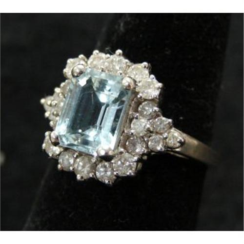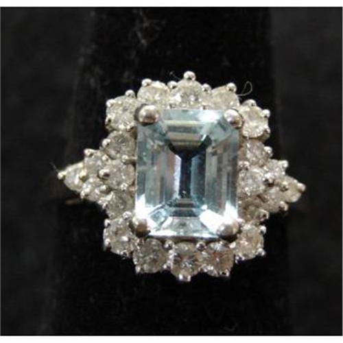 14K WHITE GOLD & DIAMOND RING. Has 2.5 ct. aqua stone surrounded by 1.33 t.c.w. of diamonds.