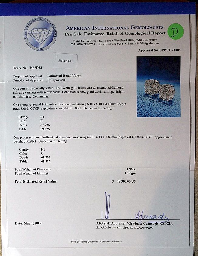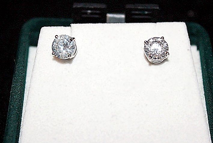 14K WHITE GOLD SOLITAIRE EARRINGS EACH WITH ONE ROUND BRILLIANT CUT DIAMOND. DIAMONDS: 1.92CTW CLARITY: I-1 COLOR: G. COMES WITH AIG REPORT. ESTIMATED RETAIL VALUE (AT TIME OF APPRAISAL: 2009): $18,300.00.