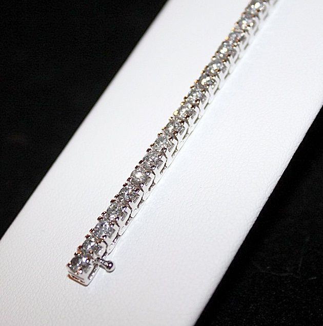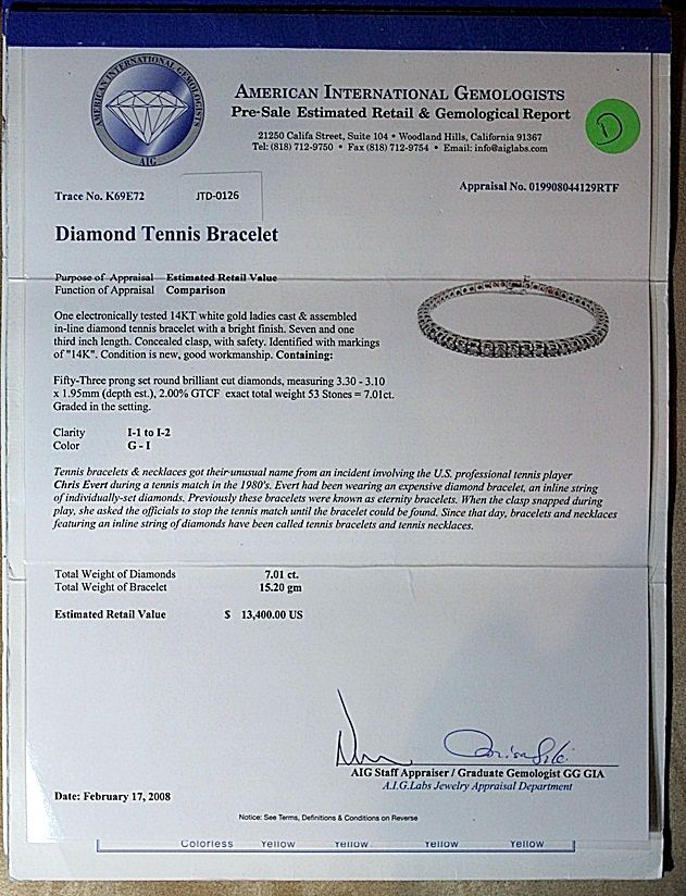 LADY'S 14K GOLD DIAMOND TENNIS BRACELET WITH 53 ROUND BRILLIANT CUT DIAMONDS. DIAMONDS: 7.01CTW CLARITY: I-1 TO I-2 COLOR: G-I. COMES WITH AIG REPORT. ESTIMATED RETAIL VALUE (AT TIME OF APPRAISAL: 2008): $13,400.00.