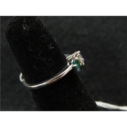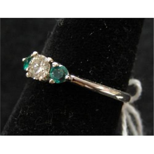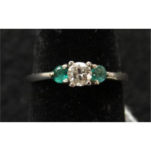 14K WHITE GOLD DIAMOND & EMERALD RING. Has single R.B.C. diamond with emeralds at both sides.