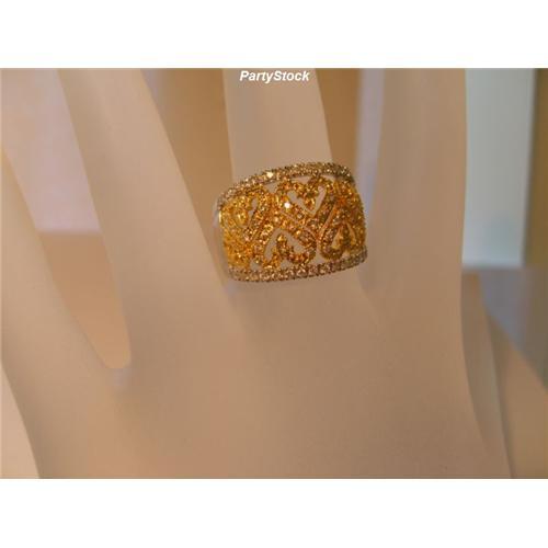 Absolutely stunning! This wide, filigree ring is rich with diamonds and brilliant yellow and white gold! Heart design is exquisite. Eye clear diamonds sparkle all over this gorgeous ring.